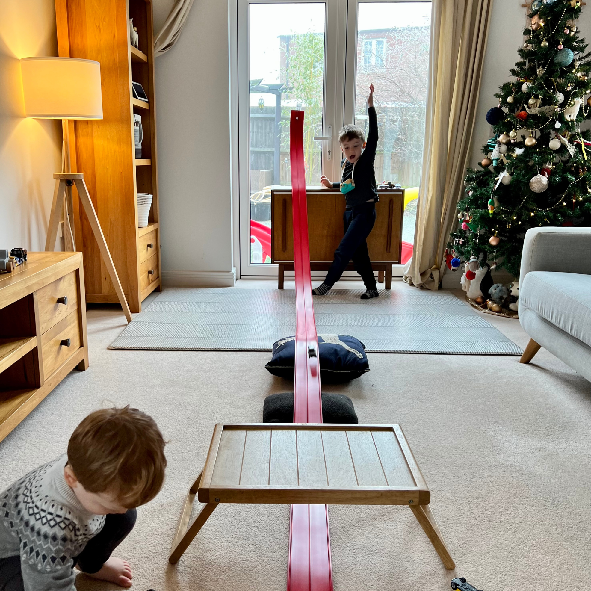 Picture the wrapping paper on the floor, the track stretched across the room, and a full-blown race happening before breakfast.